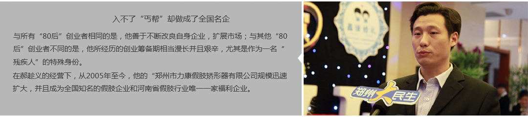 鄭州市力康假肢矯形器有限公司(簡(jiǎn)稱力康),是一家專業(yè)從事假肢矯形器的設(shè)計(jì)、研發(fā)、制作及裝 配的專業(yè)機(jī)構(gòu)。成立于1992年是河南省唯一一家福利企業(yè)。力康下設(shè)業(yè)務(wù)部、技術(shù)部、住院部、康復(fù) 部、售后服務(wù)部,并配有現(xiàn)代化的裝配車間和功能齊全的訓(xùn)練大廳,為殘疾朋友康復(fù)訓(xùn)練提供了可靠 保障??偨?jīng)理穿戴假肢多年,有著豐富的臨床經(jīng)驗(yàn)和親身體會(huì);多年來(lái),力康已為全國(guó)幾十萬(wàn)名殘疾 朋友安裝上舒適、美觀、耐用的假肢和矯形器具,使他們更大限度地恢復(fù)了正常的工作和生活?!爱a(chǎn) 品即人品”的質(zhì)量理念、先進(jìn)的技術(shù)、實(shí)惠的價(jià)格、完善的售后服務(wù)是力康取勝的法寶……